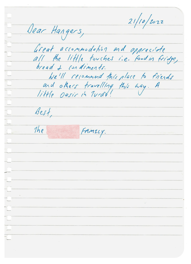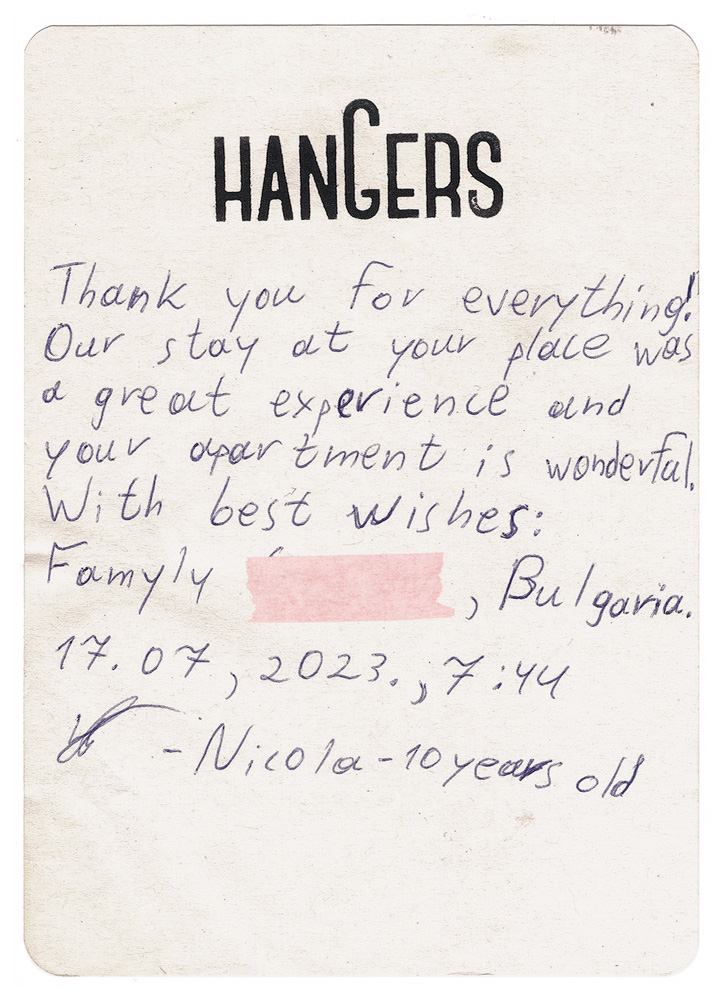 Ca-n viață, când oferi, primești: câteva mici coli cu antet se află pe biroul din fiecare cameră. În timp, mulți oaspeți le-au folosit ca să ne spună câte ceva. Le păstrăm cu sfințenie.